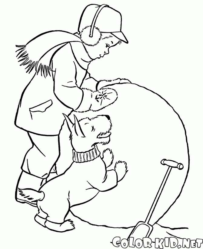 ぬりえ - 男の子が雪だるまを作る