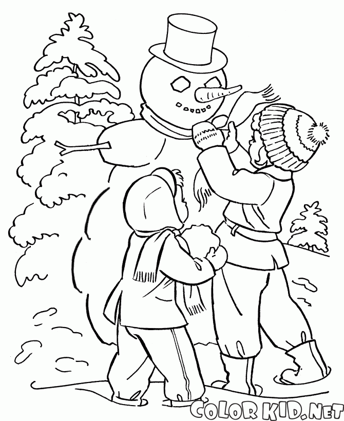 ぬりえ - 雪だるまをしている子供