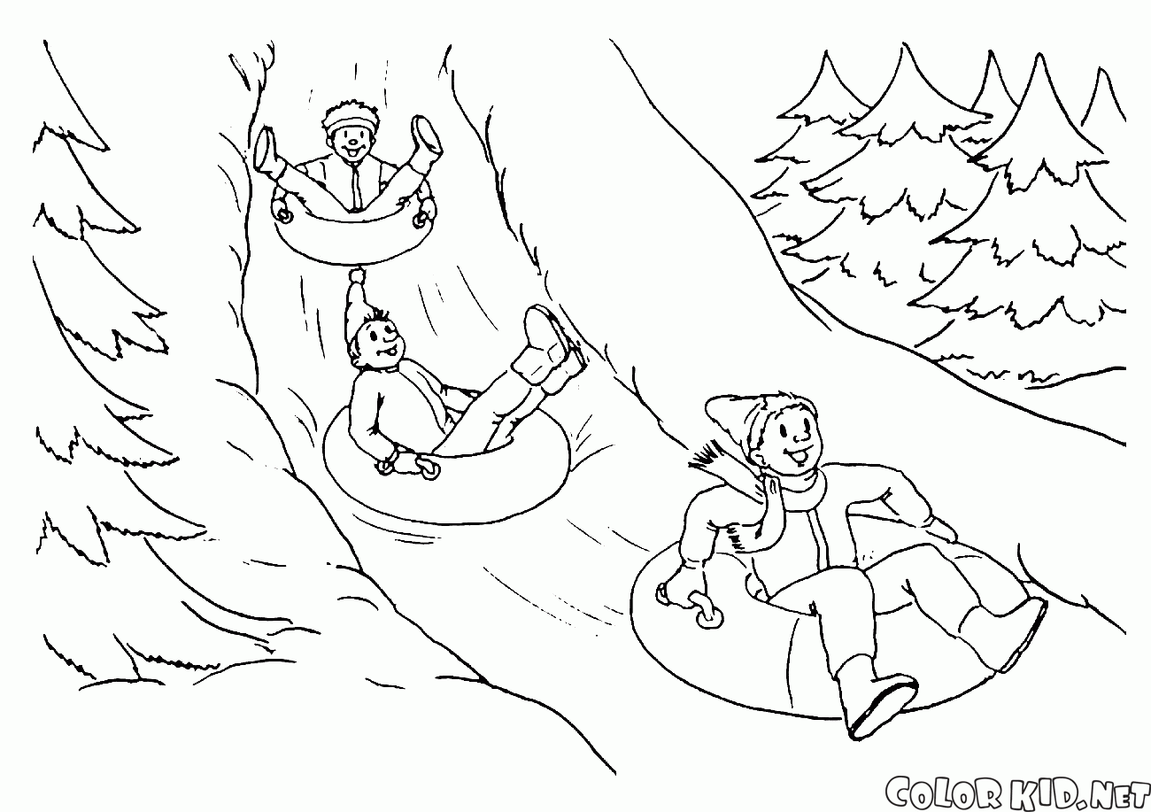 ぬりえ - 雪の丘からスライディング